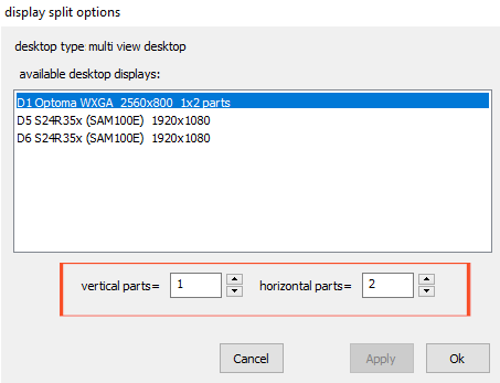 Click on the name of the display (the name of your projector) to select the display you would like to modify, and depending on your setup, set the number of split displays you want and whether they are placed vertically or horizontally. Click ‘Apply’ and ‘Ok’.