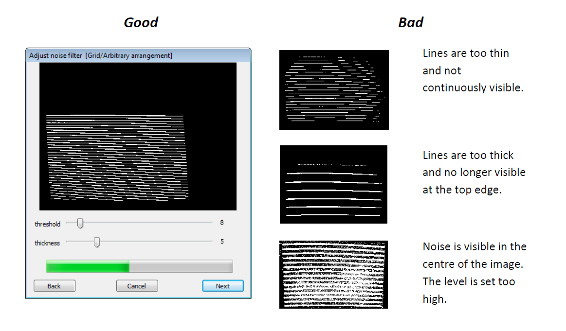 - Threshold- Glide the nob on the threshold slide bar to adjust noise levels. The aim is to have as little noise as possible. Set the threshold level so that all lines are easily visible at the edges and in the corners of the test image (striped pattern). However, be sure to avoid visible interference (noise)!