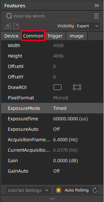 Switch to the tab “Common Functions” (3) to handle the most important parameters of the camera sensor: