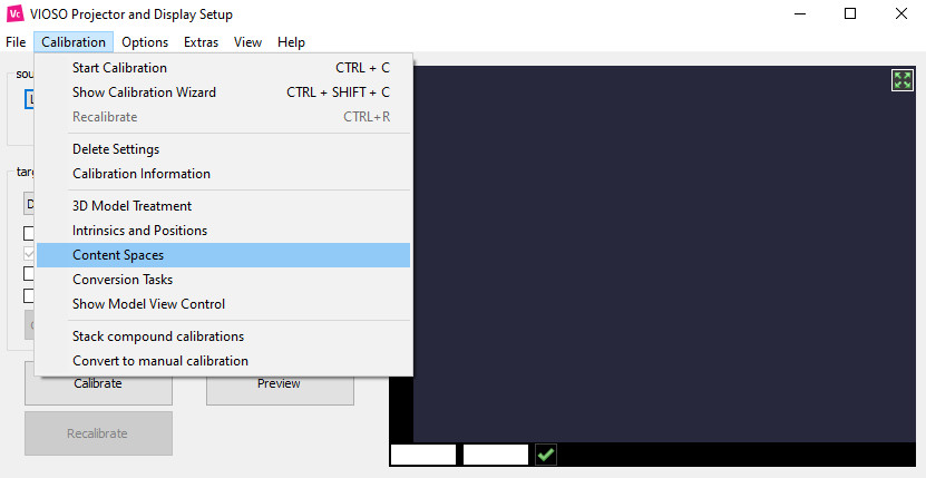 To create a 3D model and content space, from the main menu go to “Calibration” > “Content spaces” .